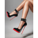 tacchi a spillo con plateau in vernice nera da donna con suola rossa, cinturini alla caviglia borchiati e borchiati, tacchi alti sexy per uscite serali, feste e abbigliamento da discoteca |