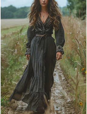 女性用 ロングドレス マキシドレス カジュアルドレス スイングドレス サマードレス 自由奔放に生きるドレス ヴィンテージ バケーション 日常 祝日 レギュラー グラフィック 長袖 Vネック ブラック 夏