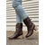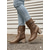 レースアップとバックルのディテールが施された女性用ヴィンテージブラウンフェイクレザー乗馬ブーツ - カジュアルにもアウトドアにも履ける膝丈の乗馬スタイル