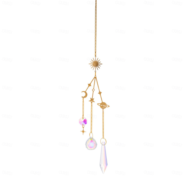 • [デザインのハイライト]: 各作品は、精巧なスターバーストのモチーフと三日月をあしらった繊細な金のチェーンを展示し、ダズリングなクリスタルプリズムとビーズが連なっています。星、涙型、六角形のような様々な形状が次元感と視覚的興味を加え、チャイムが魅惑的な反射を castし、光の中で踊ります。