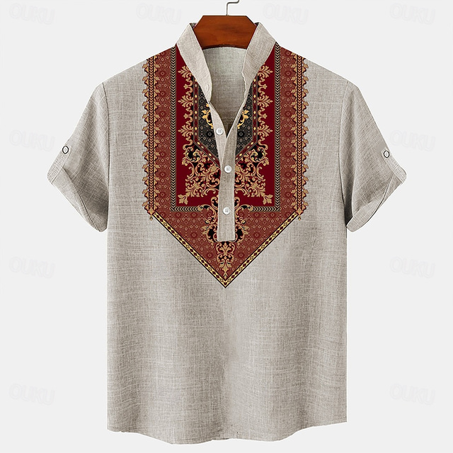 男性用 リネンシャツ ヘンリーシャツ レトロなシャツ ヴィンテージシャツ エスニックシャツ エスニック バケーション 日常着 グリーン カーキ色 グレー 半袖 スタンドカラー 夏 春 衣類 ボタン