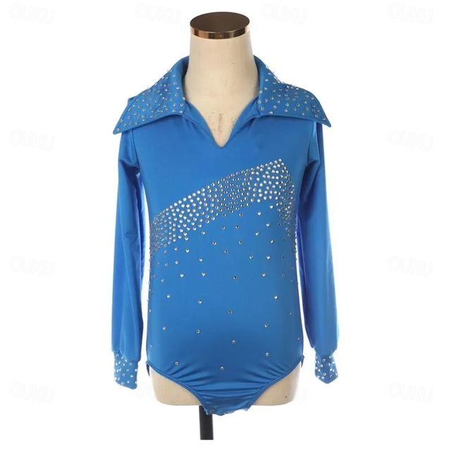 フィギュアスケート用トップス 男性用 男の子 アイススケート トップス ブルー パッチワーク スパンデックス 高弾性 訓練 競技大会 スケートウェア クラシック クリスタル・ラインストーン 長袖 アイススケート フィギュアスケート