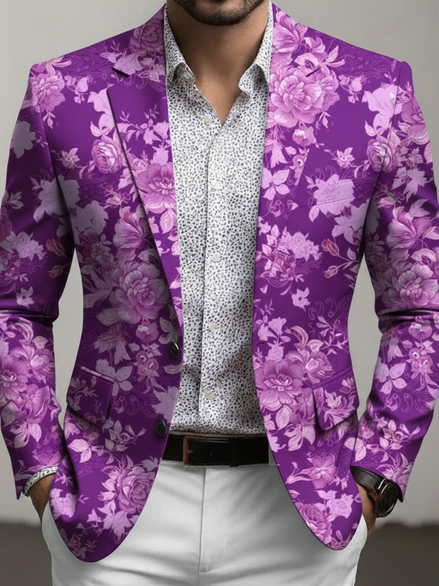 男性用 フラワープリント ブレザージャケット コート ファッション 快適 高通気性 アーティスティック カジュアル 日常 フォーマル パーティーイブニングウェア 3Dプリント ボタン マルチポケット 春 秋冬 ノッチドラペル 長袖 ブルー パープル ライトブルー