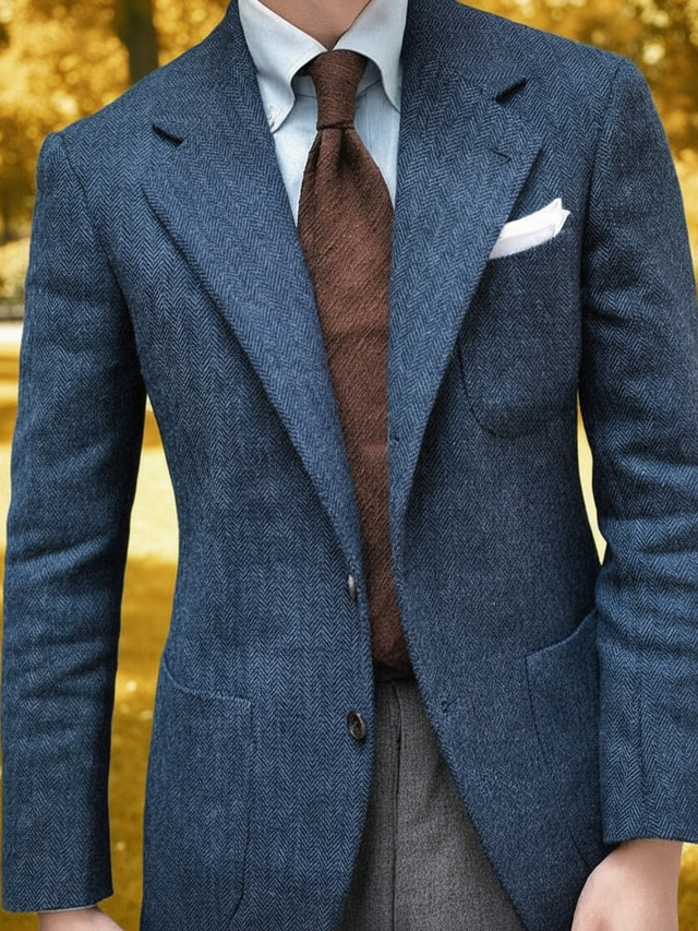 男性用 ツイードブレザー ノッチカラー レトリ/ヴィンテージ ヘリンボーン Blazer ブルー プラスサイズ シングルブレスト 2つボタン
