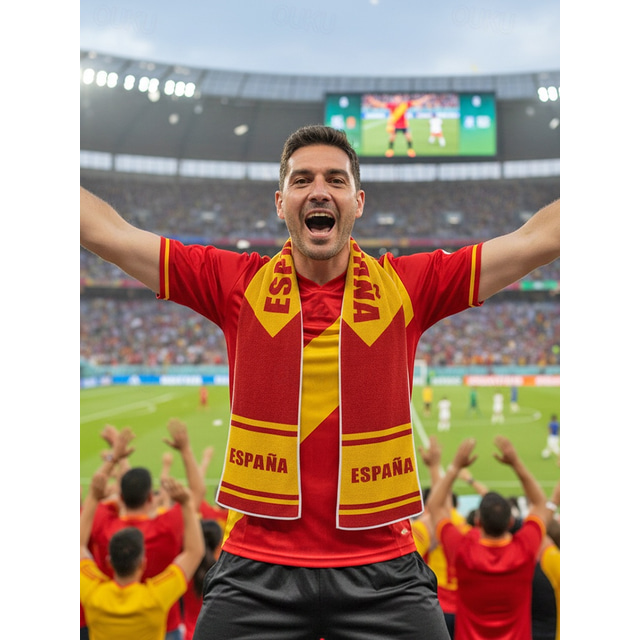 2026年 メンズ スペイン国旗プリント ポリエステルタオルスカーフ、サッカーの試合観戦、スタジアムイベント、スポーツ観戦、普段使いに最適な柔らかいサッカーファン応援スカーフ  コレクション – US $9.99 –P1