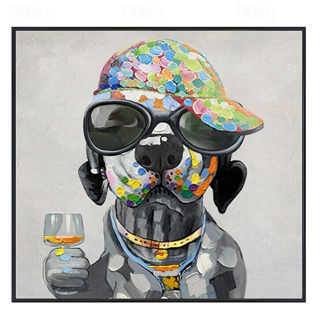 [スタイル]: この絵画は、現代的でモダンな抽象スタイルを特徴としています。カラフルな描写には、無邪気な犬が多数の明るいドットや、パターンのあるキャップ、大きなサングラスといったスタイリッシュなアクセサリーで飾られており、どんな空間にもユーモアと魅力を加えています。