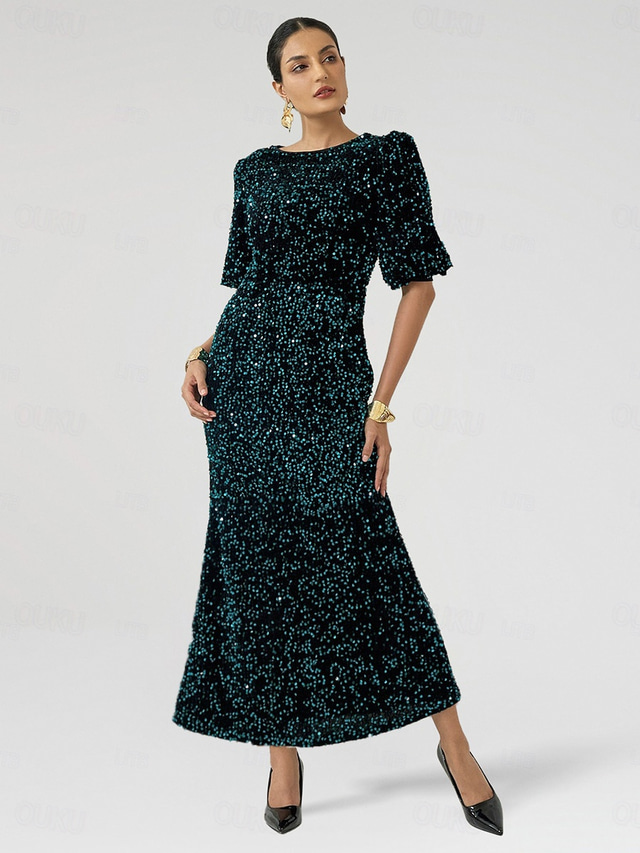 ベロアのスパンコールのパフスリーブがキラキラ輝くエレガントなマキシドレス