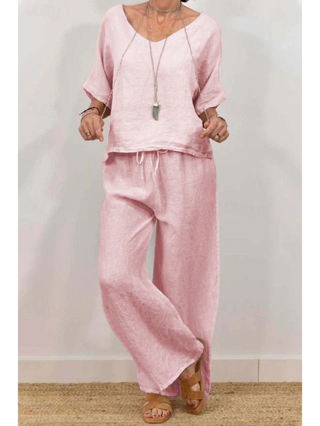 女性用 シャツ コットンブレンド リネン風セット ハーフスリーブ Vネック 純色 ドローストリング 活発的 ベーシック 祝日 カジュアル/普段着 ブラック ピンク グリーン 夏 レギュラー