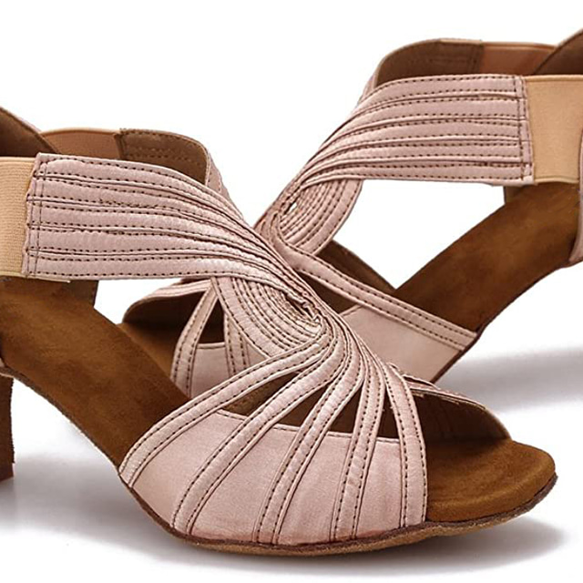 女性用タンストラップラテンダンスシューズ - サルサ、タンゴ、パフォーマンス用の伸縮性のあるストラップが付いたつま先が見えるハイヒールの社交サンダル
