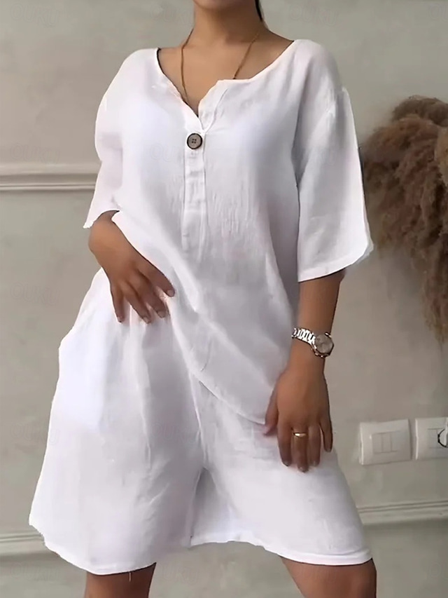 女性用 シャツ コットンブレンド リネン風セット バギーショーツ 半袖 クルーネック 純色 パッチワーク 日常 カジュアル ブルー ホワイト ルビーレッド 夏 ルーズフィット