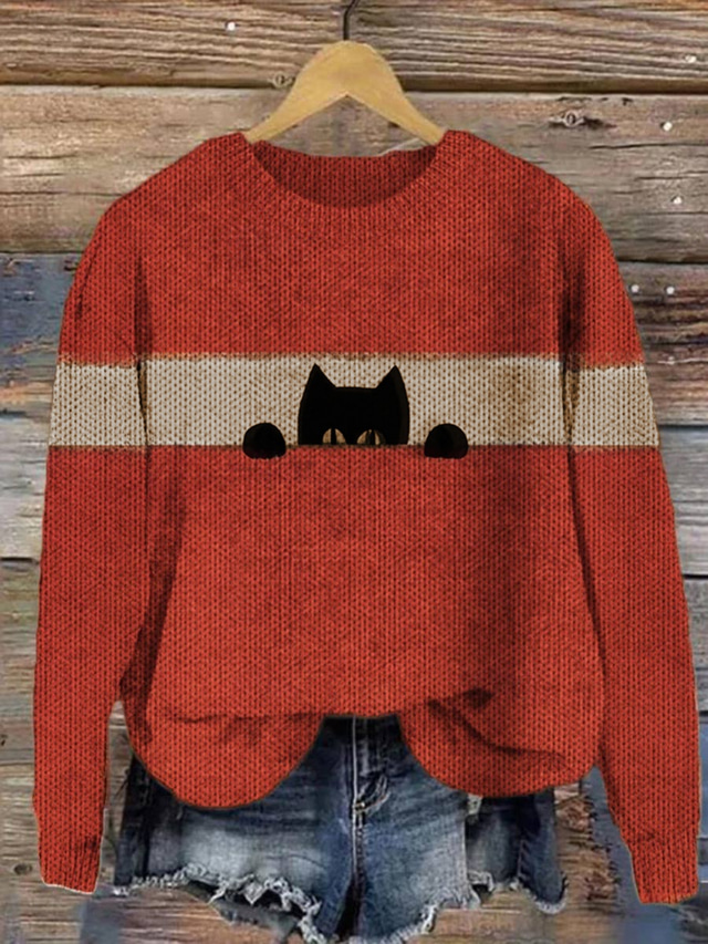 女性用 ニット 日常 グラフィック クルーネック プリント 長袖 レギュラートップス ニット フォーマル 週末 ブラック ルビーレッド 秋 冬