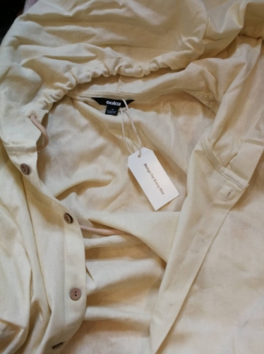 PCの画像で見るよりも、届いたシャツはカーキ色というより、ライトカーキとかクリーム色でした。