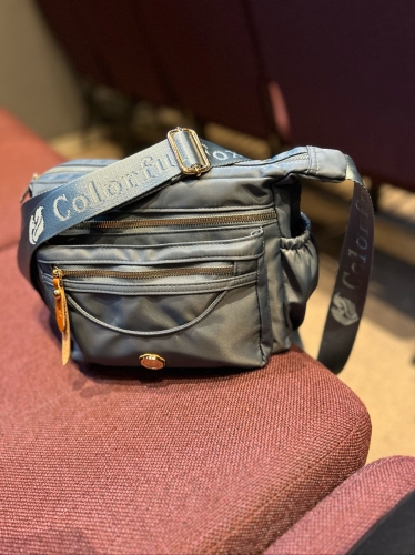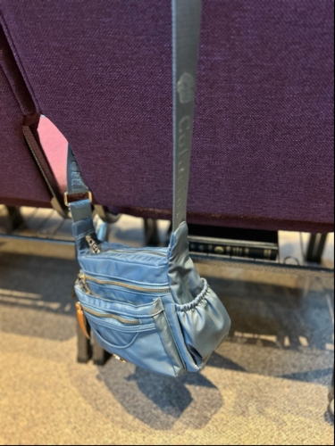 This purse is a beautiful blue color and it has so many zippered pouches to use.