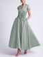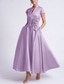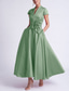 A-lijn Tot de enkel Cocktailjurken Elegant Bloemig Korte mouw Schouderafhangend Bruiloft Formeel Zak Satijn met Geborduurde bloem Plooien