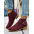 Bordeauxrode enkellaarsjes van imitatiesuède met gespband voor dames – stijlvolle laarzen met lage hak voor casual outfits, buitenwandelingen en herfstkleding