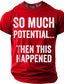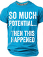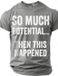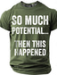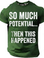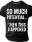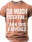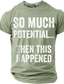 Mannen hebben zoveel potentie, en toen gebeurde dit. Grappig, sarcastisch T-shirt met zelfspot, humoristische quote, verweerde tekst, casual, korte mouwen, designerkleding, maten S, M, L, XL, XXL,
