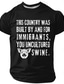 T-shirt voor heren met een verweerde varkensprint. Tekst: "Dit land is gebouwd door en voor immigranten, jullie onbeschaafde varkens." Grappige, sarcastische tekst. Ronde hals, normale pasvorm,