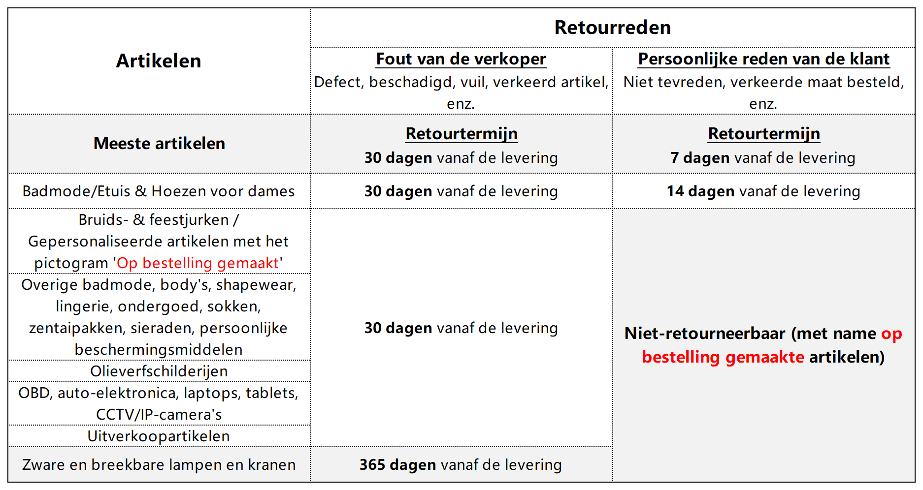 Behalve voor sommige op bestelling gemaakte, op maat gemaakte of speciale producten zoals vereist door wettelijke wetten die van toepassing zijn op uw lokale landen of regio's, kunnen de overgrote meerderheid van de producten worden geretourneerd. De specifieke voorwaarden variëren echter afhankelijk van de reden voor retournering en het type product. Raadpleeg de onderstaande tabel voor details.