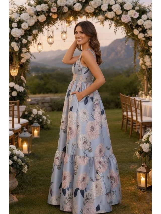 A-lijn Tot de grond Bruiloft gast jurk Formele jurk Avondjurk Galajurken Elegant Mouwloos Spaghettibandjes Schoolfeest Formeel Satijn met Bloemenprint