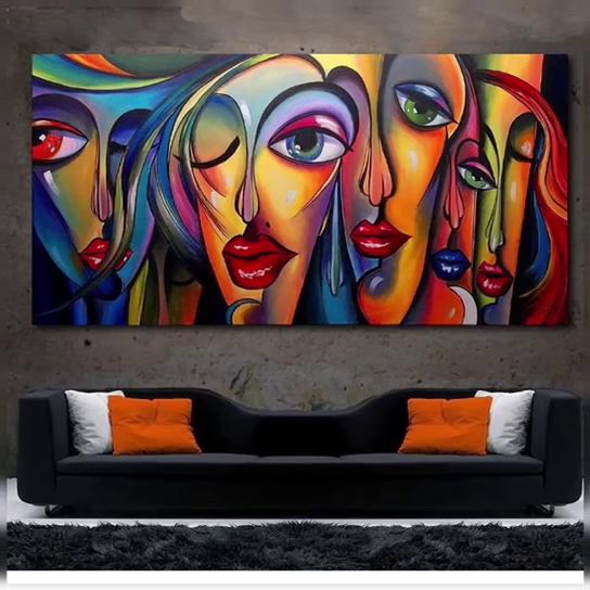 [Canvas en Materiaal]: Gemaakt op hoogwaardig canvas, zorgt deze olieverf schilderij voor duurzaamheid, en een gladde textuur versterkt het ingewikkelde penseelwerk en de levendige pigmentatie. Dit horizontale formaat staat artistieke expressie toe over zijn uitgestrekte oppervlak, wat zorgt voor een gedurfde visuele impact. [Ontwerp en Stijl]: Dit schilderij toont een levendige en fantasievolle afbeelding van menselijke gezichten in een moderne popartstijl. Met elementen geïnspireerd op het kubisme, is elk gezicht uniek overdreven met grote expressieve ogen en uitgesproken lippen, wat een surrealistische twist aan de compositie toevoegt. [Ontwerp Hoogtepunten]: Het ingewikkelde gebruik van levendige kleuren zoals oranje creëert een opvallende visuele impact, waardoor elk element van het kunstwerk eruit springt. De horizontale indeling en het gedurfde kleurenpalet geven het een hedendaagse flair, ideaal voor degenen die een statement willen maken. [Gelegenheden en Plaatsing]: Ideaal voor woonkamers, kantoren of creatieve ruimtes, voegt dit schilderij een gedurfde en creatieve sfeer toe. Het is perfect voor degenen die hun interieurontwerp willen doordrenken met artistieke flair, hedendaagse stijl en een gespreksonderwerp. [Maat Suggestie]: Dit oversized gerolde canvas meet 48 x 94 inch (120 cm x 240 cm), waardoor het een significant statementstuk is dat de aandacht trekt en grotere wandruimtes aanvult.