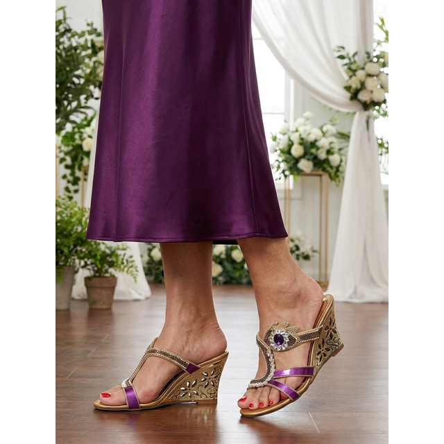 Paarse, versierde sleehak sandalen voor dames - elegante schoenen voor de moeder van de bruid bij stadsbruiloften