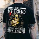 Heren Edgy Graphic Tee 'Jij mijn vriend had doorgeslikt moeten worden' Grim Reaper Skull Print Korte Mouwen |