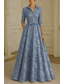 A-linje Gulvlengde Kveldskjoler Elegant Blomster Brudens mor 3/4 ermer V-hals Hage fest Bryllup Sateng Blonder med Plissert