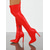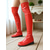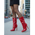 Røde støvletter over kneet til dame – lårhøye støvletter i kunstskinn med flat hæl og glidelås på siden til cosplay, kostymefester og julestreetwear