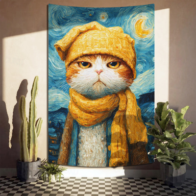Morsom van Gogh-parodi, katt iført gul hatt og skjerf, stjerneklar natt, oljemaleri, veggteppe til stue, soverom, sovesal, gave til katteelskere