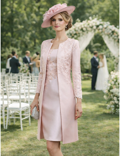 Kjolesett Kne-lengde Bryllupsgjestkjole Mor til bruden Kjole Langermet Rundhals Elegant Enkel Bryllupsgjest med Ensfarge