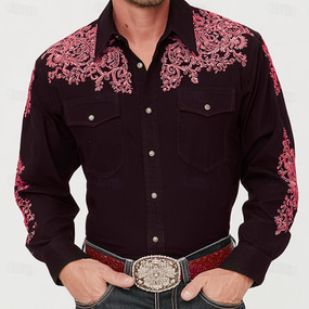 Herre Konsistens 3D Swirl Intrikat blomstermønster Skjorte Skjorte med knapper Langermet Vintage retro Mørk gotisk stil utendørs Ferie Vår Høst Aftæpning 3D-utskrift krage skjorter Burgunder Lilla