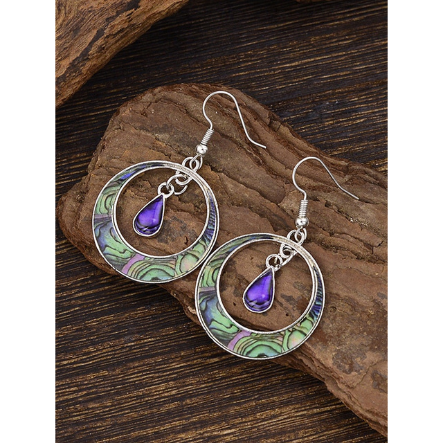 Bohemske øredobber i legering til dame med lilla dråpeformet overflate, fargerikt rundt design, perfekt for hverdagsbruk og strandferier