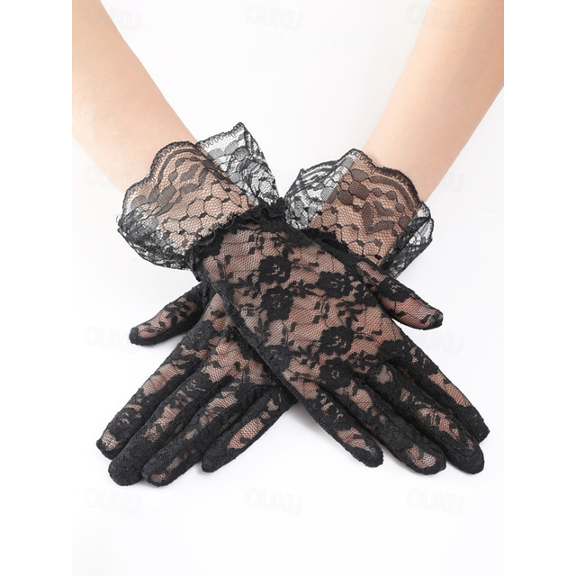 Damehansker i polyester med blonder, elegant blomsterdesign, myk og lett passform, klassisk vintagestil i flere farger, bryllupshansker for kveldsfester, skoleball og formelle arrangementer