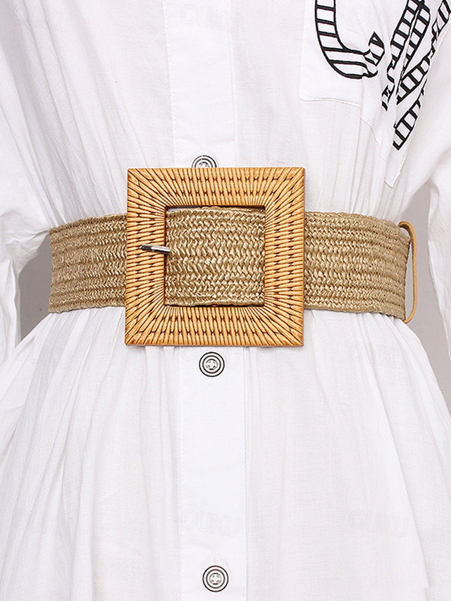 kvinners vevde stråbelte med overdimensjonert firkantet spenne – boho chic stil, justerbar passform for fritids- eller strandklær, perfekt for vår- og sommerantrekk