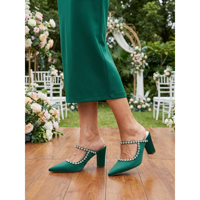 Damesko med elfenbensfarget blokkhæl og strassrem, elegante sko til brudens mor til utendørs hagebryllup