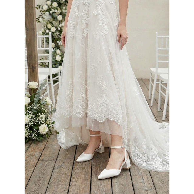 Enkle hvite damesandaler med grov hæl – elegante brudesko til hagebryllup