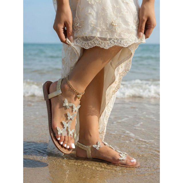 hvite brudesandaler til dame - elegante strandbryllupssko med strass-sommerfugler
