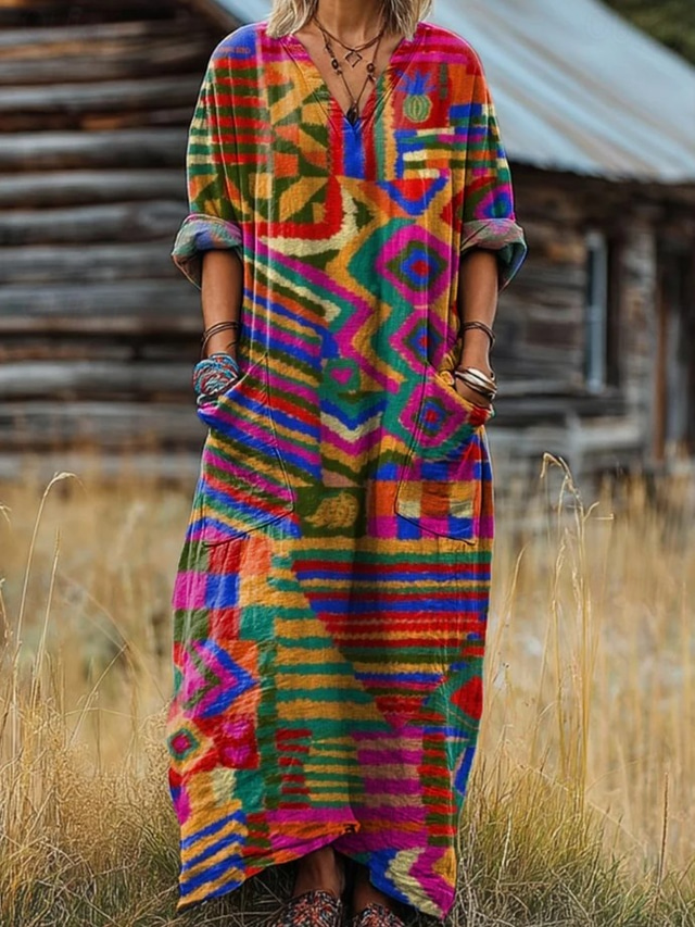 Kjoletye:Solkjole,Kjole med A-linje,Stoff:Polyester,Kjønn:Dame,Design:Trykt mønster,Lomme,Lapper,Anledning:Ferie,Daglig,Bursdag,Stil:Ferie,Fritid,Bohem,Passform:Løstsittende,Kjolelengde Type:Maxikjole,Halslinje:V-hals,Ermelengde:Langermet,Elastisitet:Uelastisk,Ta vare på meg:Maskinvask,Mønster:Blomstret,Årstid:Høst,Vår,