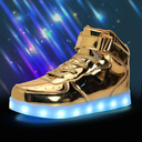 złote, podświetlane diodami LED wysokie trampki dla dzieci i mężczyzn z kolorową podeszwą, regulowanym paskiem i błyszczącym wykończeniem |