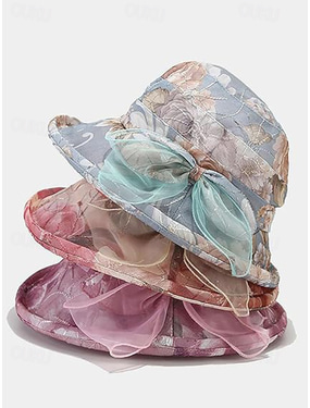 Chapéu de sol feminino estilo boêmio, respirável e leve, em poliéster, com estampa floral multicolorida e laço, perfeito para férias na praia, uso casual no dia a dia e viagens de verão.