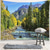 Tapeçaria de parede com paisagem de montanha, floresta, rio e pinheiros, ideal para sala de estar, quarto e decoração de casa.