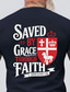 Camiseta masculina com estampa "Salvos pela graça mediante a fé" (Efésios 2:8), escudo vermelho, cruz, coroa e cordeiro. Manga curta, modelagem padrão, para uso diário. Disponível nos tamanhos P, M,