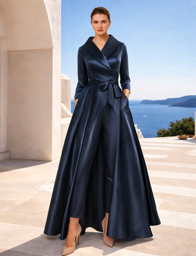 Terninho Até o Tornozelo Vestido Para Mãe dos Noivos Manga 3/4 Colarinho de Camisa Elegante Festa Simples Formal Convidado do casamento Cetim com Laço(s)