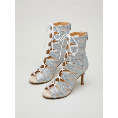 Mulheres Sapatos de Dança Latina Sapatos Salsa Interior Espetáculo Lantejoulas de Cristal com Brilho Salto Palmilha mais macia Salto Alto Peep Toe Correia Cruzada Adulto Prateado / Brilho cintilante