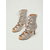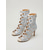 Sandálias femininas prateadas de salto alto com cadarço e detalhes em tela - botinhas de cano curto com tiras brilhantes e bico aberto, perfeitas para bailes e coquetéis.