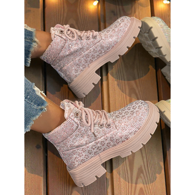 Botas de cano curto femininas com cadarço e glitter - botas de combate com plataforma grossa e strass brilhantes, estilo moderno para festas e baladas. &trajes de noite