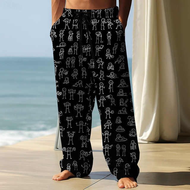 Homens Calças Calças largas Calça casual Cintura elástica com cordão Calças de linho com bolsos Pessoas Boneco de palito Comprimento total Ao ar livre Férias Engraçado Preto Branco Sem Elasticidade