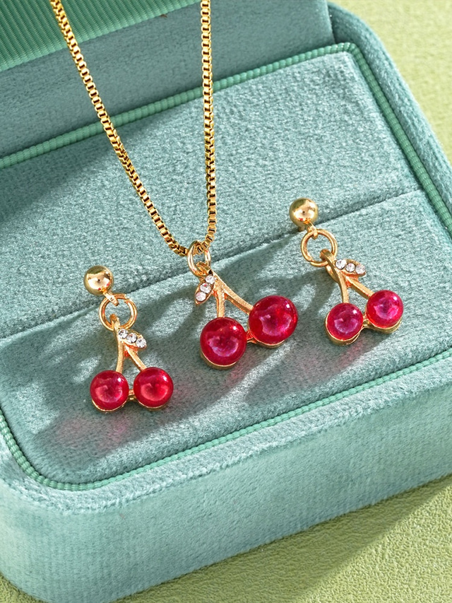 Conjunto de brincos e colar de cereja natalinos femininos - material de liga metálica com detalhes em cristal, design festivo em vermelho, joias perfeitas para festas e ocasiões especiais.