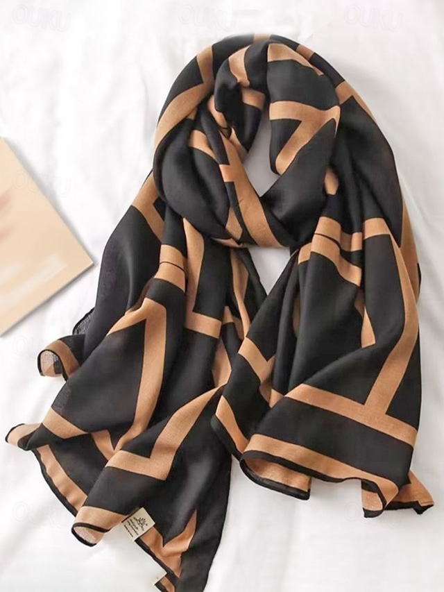 Lenço feminino elegante em poliéster com estampa geométrica, modelo chique em preto e marrom, ideal para o dia a dia e para ir ao trabalho. Leve e macio, perfeito para o escritório e viagens. Acessório versátil para todas as estações.