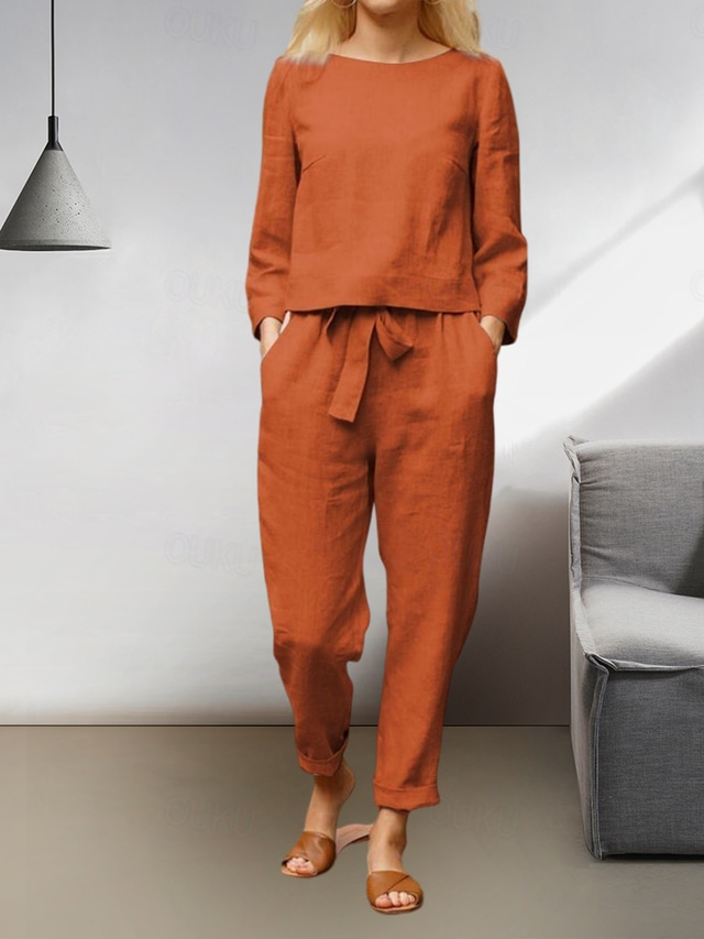 Gênero:Mulheres,Modelos de Lingerie de Noite:Loungewear,Conjuntos,Detalhes:Cintura elástica,Bolsos,Estampa:Cor imaculada,Tecido:Algodão E Linho,Estilo:Básico,Simples,Ocasião:Diário,Rua,Decote:Gola Redonda,Elasticidade:Micro-Elástica,Estação:Verão,Primavera,Tipos de Blusa:Conjuntos de linho de algodão,Camiseta,Função:Respirável,Comprimento da Manga:Calça comprida,Manga Longa,Tipo de fundo:Calça,